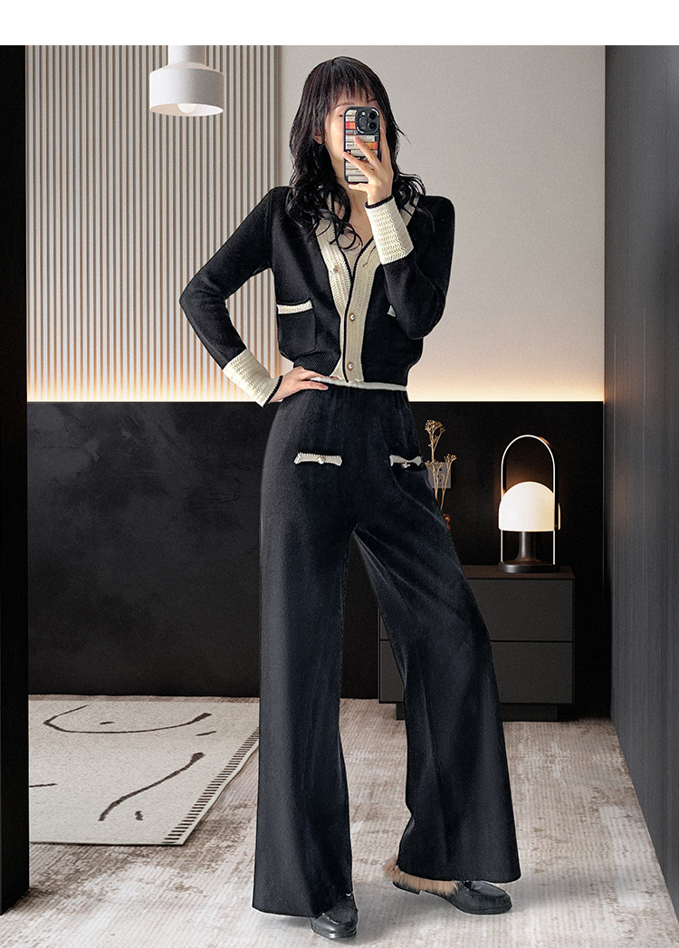 セーター パンツ セットアップ 配色 ニット 着痩せ ワイドパンツ カジュアル 上下セット 長袖 vネック ゆったり感 エレガント 30代 40代