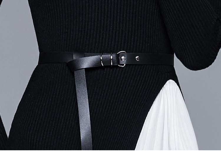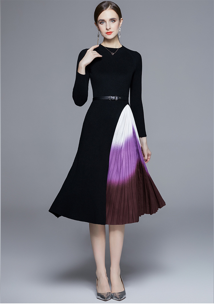ワンピース ラウンドネック 長袖 ハイウエスト 切り替え Aライン 配色 お腹カバー ウエストリボン プリーツ スタイリッシュ デザイン感 個性的 セクシー デイリー S~XXL