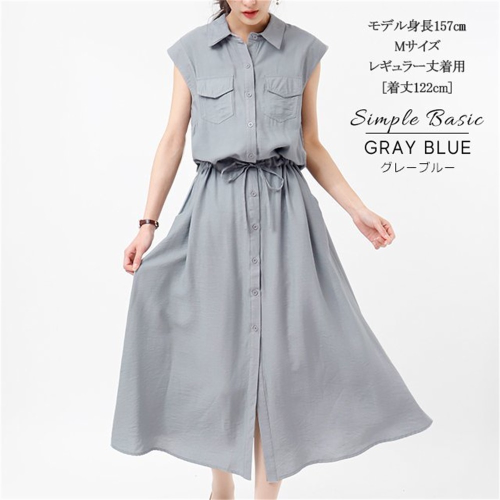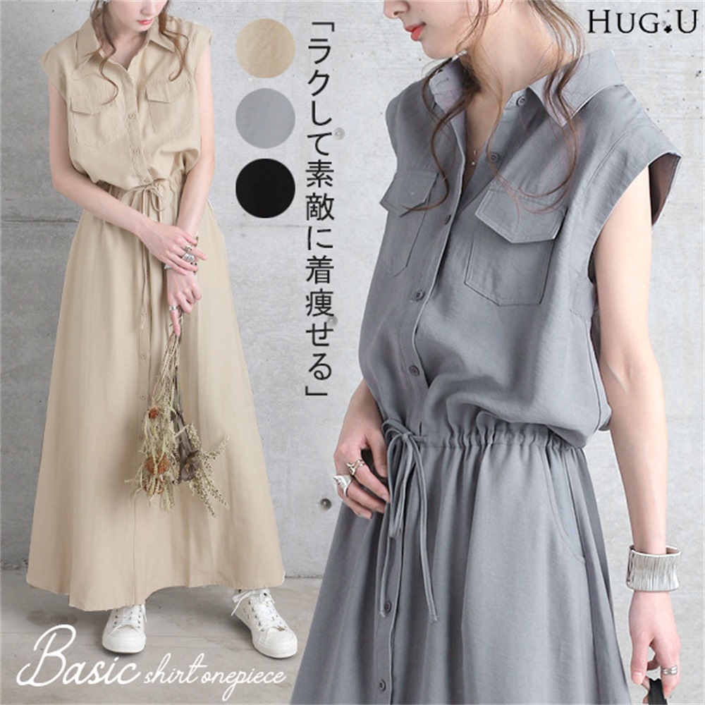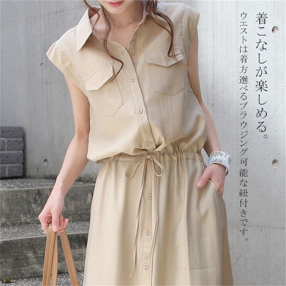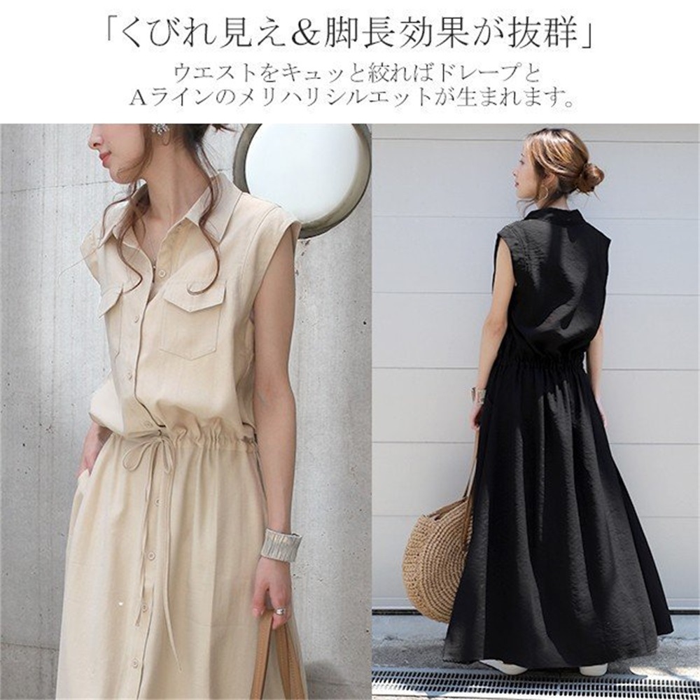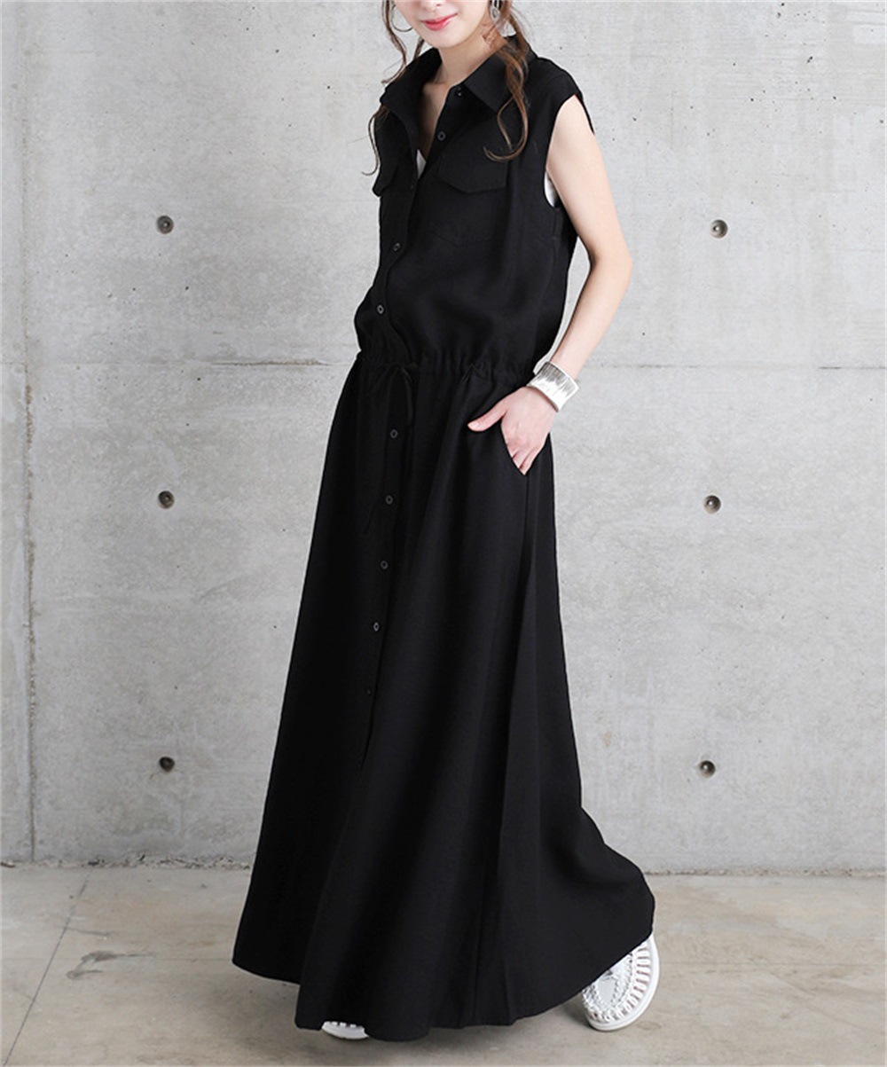ワンピース ロングワンピース シャツワンピース ノースリーブ ポケット ウェストゴム 無地 黒 きれいめ 春 夏 黒 Aライン ウエストマーク3色 S-XXL