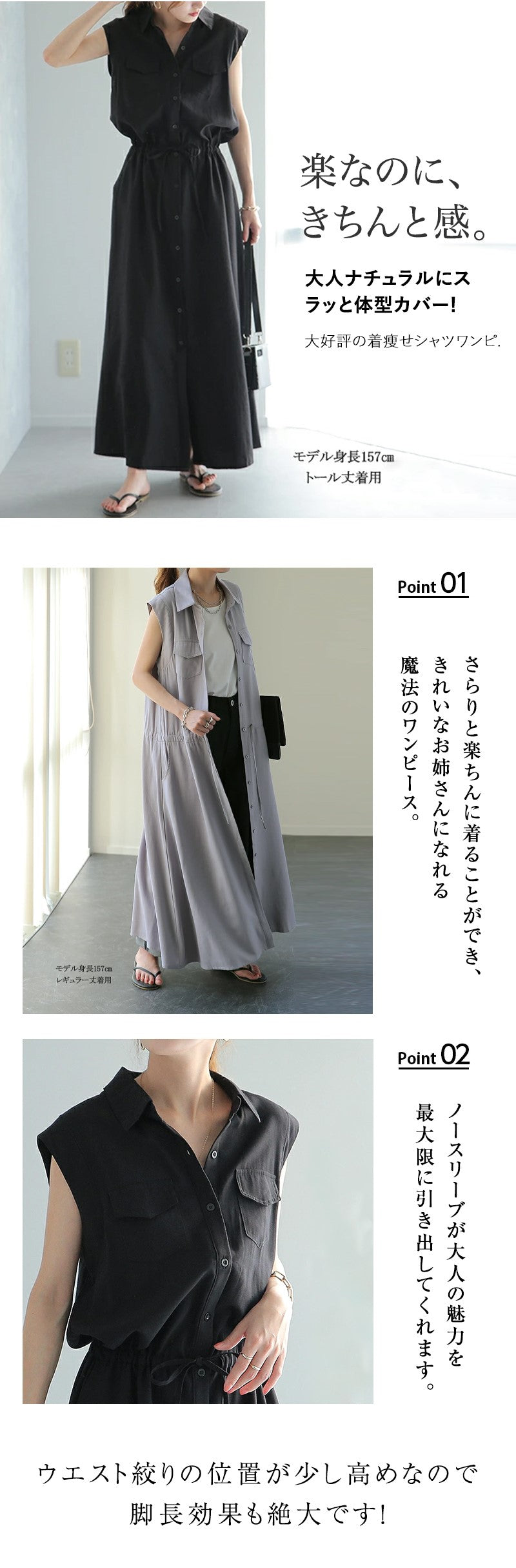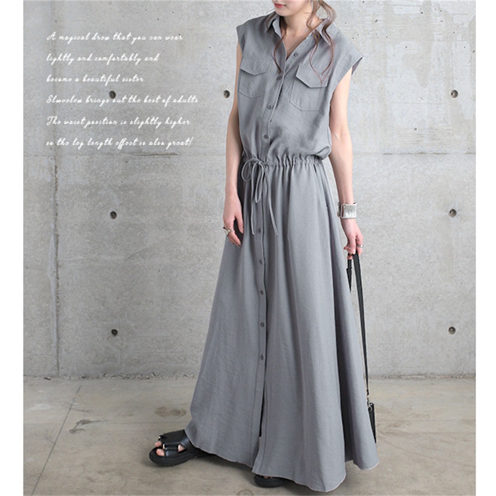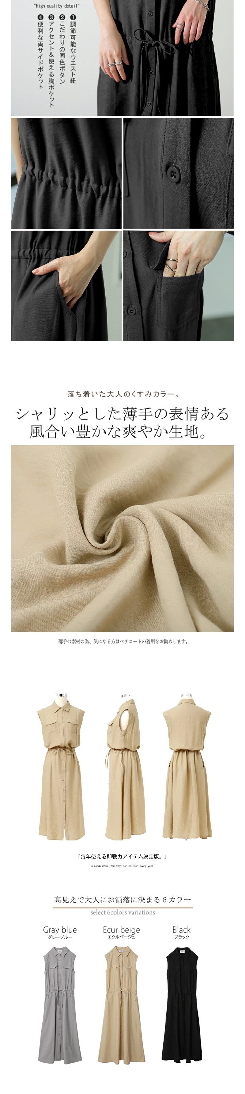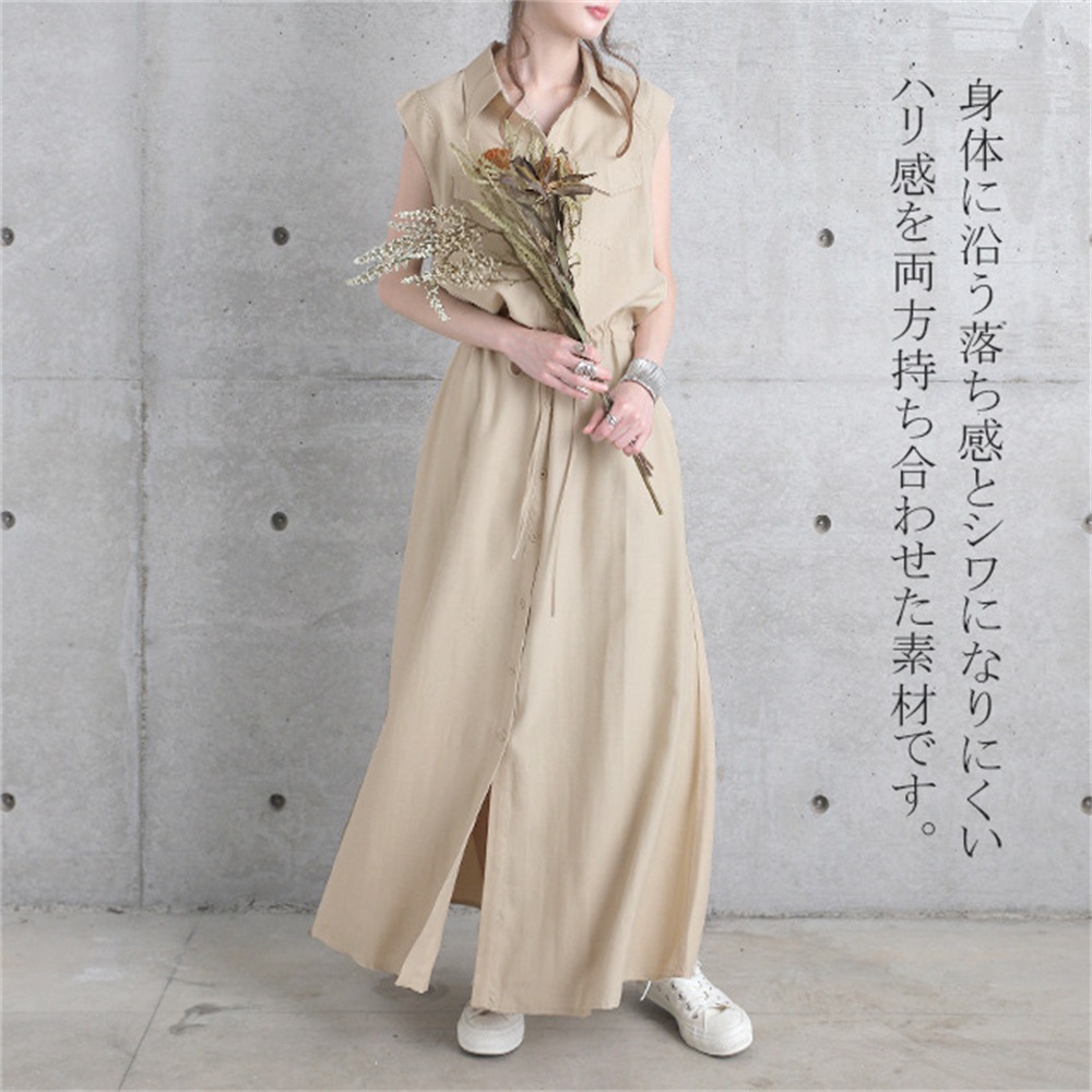 ワンピース ロングワンピース シャツワンピース ノースリーブ ポケット ウェストゴム 無地 黒 きれいめ 春 夏 黒 Aライン ウエストマーク3色 S-XXL