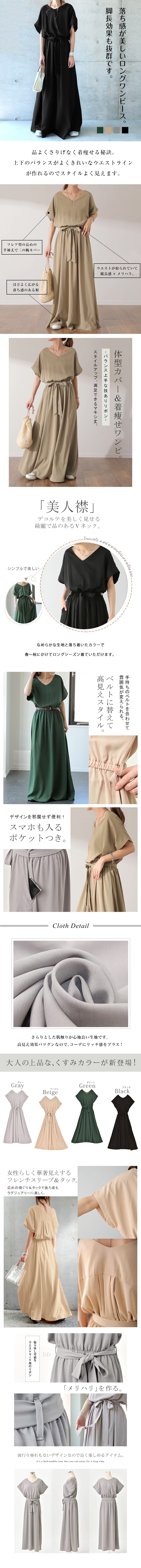 ワンピース マキシ丈ワンピース レディース 半袖 体型カバー 無地 シンプル フレンチスリーブ きれいめ ウエストマーク 黒 グリーン 大きいサイズ 春 夏 4色 S-3XL